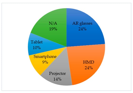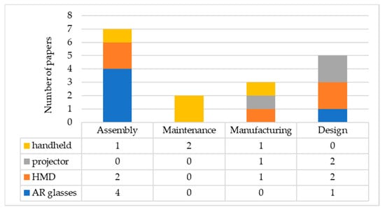 Regarding the visualization device, head mounted displays, HMDs and AR glasses have the most significant use among the analyzed works. A projector device was preferred in 3 of the total of 21 papers and hand-held devices (smartphones and tablets) in 4 papers. In one paper the author did not mention what device was used and in three papers this characteristic is not applicable (Figure 13). Figure 14 shows the distribution of papers according to the visualization device for the four application fields presented in Subsection 3.4.