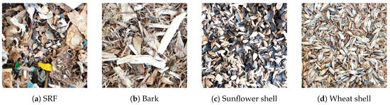 The renewable active particles examined in the present study are Solid Recovered Fuel (SRF), bark, sunflower shell, and wheat shell (see Figure 1). The samples were taken from a Hungarian waste treatment plant. The characteristics of the active particles used in the present study are shown in Table 2 and Table 3. The examined SRF corresponds to the European standard EN 15359. This standard classifies the SRF based on the net calorific value (NCV), sulfur (S), and chlorine (Cl) data. According to this standard, the examined SRF is classified as 4,2,2. The bark is classified as a non-hazardous waste from the wood processing industry according to the European waste code (EWC code: 030101). Because it is available in a high amount, it can be utilized as renewable biomass fuel in fluidized bed power plants. Sunflower and wheat shells are agricultural wastes, and their availability is seasonal. Because of their high heating values, it is economical to store and transport them. In general, these biomass fuels are secondary or waste biomasses. Thus, the utilization of these fuels does not affect the agricultural food cultivation.
