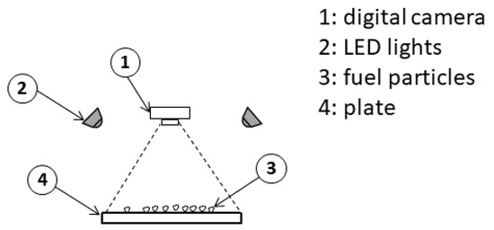 The particle size distribution (PSD) analysis was performed by using a MATLAB code that is based on a sieveless segmentation technique [22,23,24]. The imaging setup is shown in Figure 2.