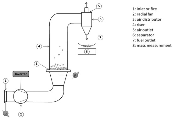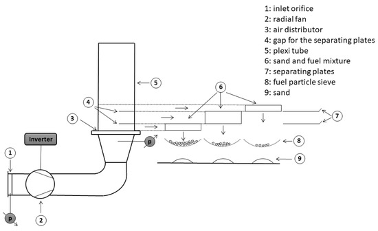 Figure 3 shows the schematic view of the lab-scale test rig used in the particle entrainment experiments. The test rig consists of a riser from plexiglass and has an internal diameter of 192 mm. Here, only the SRF, bark, sunflower shell, and wheat shell particles were investigated (used and put into the facility), which are otherwise the active particles. The air volume flow was measured with an inlet orifice connected to a manometer. A radial blower was used to produce the desired airflow through the air distributor, which consists of 1160 nozzles of 1 mm diameter each. At the outlet of the riser, a separator is used to detach the entrained particles from the airflow.