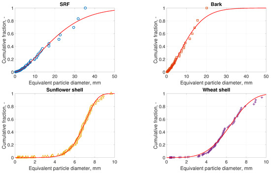 Particle size distribution of solid refused fuel (SRF), bark, sunflower shell, and wheat shell (markers), and the best-fitting Rosin-Rammler curves (solid lines).