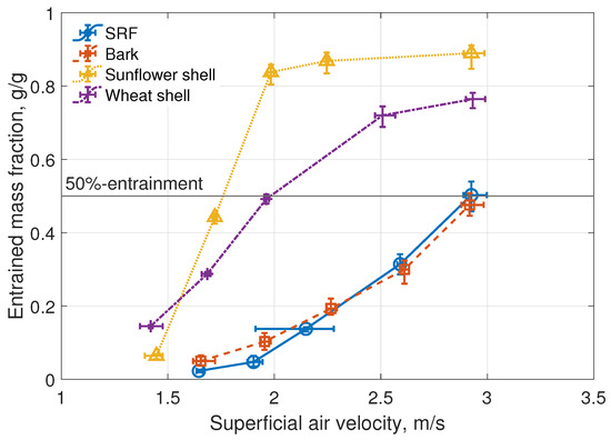 Particle entrainment is one of the fluid-dynamic characteristics that depend on the type of the actual solid fuel. Figure 6 presents the accumulated entrained mass fraction of the investigated particles (SRF, bark, sunflower shell, and wheat shell) as function of the superficial gas velocity. This figure shows that there is a significant difference in the entrainment behaviors of the investigated particles. For example, the sunflower shells entrain from the bed in the highest degree; however, at very low velocity, the entrainment of wheat shell is the most intensive. The entrainment behaviors of the investigated SRF and bark samples are similar. However, the SRF is entrained relatively less than the bark at the low fluidization velocities, and more than the bark at elevated velocities. Also, the 50%-entrainment line shows that the velocity at which 50% of the investigated particles is entrained is higher for the larger particles (SRF and bark), irrespectively of their diverse densities.