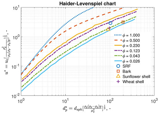 Haider and Levenspiel [29] proposed an empirical-based chart for estimating the particle terminal velocity. This chart contains a set of curves offsetting by the degree of particle sphericity. Figure 7 show this chart, together with the data representing the renewable fuels as measured in the current work. The 50% entrainment data were taken from Figure 6 as they characterize well the sets of irregular particles. Figure 7 indicates that the investigated renewable fuels behave like low sphericity particles. More precisely, the curve running closest to the data gained from the SRF measurements corresponds to a sphericity of , and similar conclusions can be taken for all other investigated fuels. According to this, the characteristic sphericity of bark and wheat shell is , and that of sunflower shell can be well approximated by .