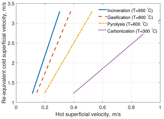 In fluidized bed energy applications, the operating temperature is high and it depends on the conversion process e.g., incineration, gasification, pyrolysis, and carbonization. The present measurements were performed on a cold basis to avoid conversion of the active particles. Furthermore, we need to address exclusively the fluid dynamic phenomenon without complications that can result from the hot-condition. To over come this technical problem, we need to link the superficial velocity of the hot basis to the investigated cold basis superficial velocity range. This correction can be obtained from the similarity of the drag force between the hot basis and the cold basis. Therefore, the consequent similarity of the particle Reynolds number () is used to obtain the hot basis superficial velocity as follows:
