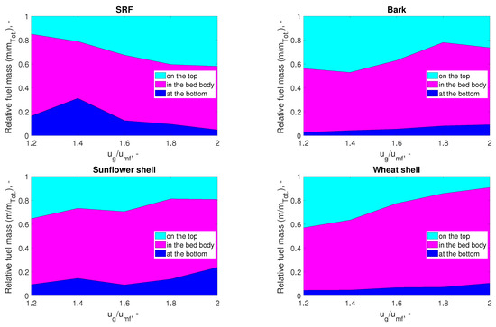 Figure 9 shows the vertical arrangement of the investigated renewable active particles as functions of the fluidization velocity. As visible, SRF has relatively high mass fraction in the central region (in the bed body) and at the bottom of the fluidized bed at low superficial velocities, while at elevated velocities, the entire mass of this fuel is shifted upwards. The opposite tendency can be observed in cases of all other investigated biomass fuels.