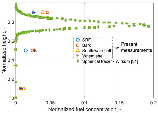 On the other hand, it is also important to understand the difference in the mixing characteristic among these nonspherical active particles and a representative spherical tracer. Previously, Wirsum [31] studied the segregation behavior of the active particles in a fluidized bed using a spherical tracer in electromagnetic field [32]. The spherical tracer had an average density of 720 kg/m and a diameter of 60 mm. This tracer showed clear segregation with an inverted-C profile when fluidized in sand. Figure 10 presents a comparison among the vertical concentration of the SRF, bark, sunflower shell, wheat shell, and the spherical tracer of Wirsum [31] in the bubbling fluidized bed. (Note that the vertical concentration used here differs from the mass fraction used in Figure 9 because the concentration depends on the mass of the bed material and the volume.)