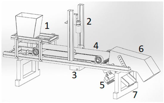 Sorting machine prototype with marked components: 1. Feeder, 2. Camera, 3. Illumination, 4. Conveyor, 5. Air nozzles and valves block, 6. Catcher of ejected material, 7. Catcher of separated material.