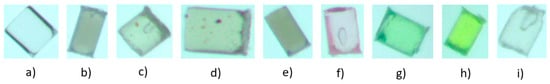 The sorting material comprised transparent polycarbonate (PC) in the granules, as shown in Figure 2. The granules were 3 mm wide, 4 mm high, and 2 mm thick. The granules were of different colors. Other defects on the granules were spots that represent burns that can form during the plastic injection process. Through sorting, all of the granules with impurities must be ejected. Only completely transparent material, as shown in Figure 2a, is acceptable for reuse.