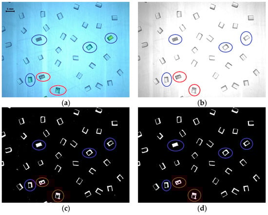 Image processing operations: (a) Original image; (b) RGB green color extraction and brightness settings; (c) Modified Sauvola threshold; (d) Particle filter. Blue color indicates marked pellets with color defects and red color indicates pellets with structural defects.