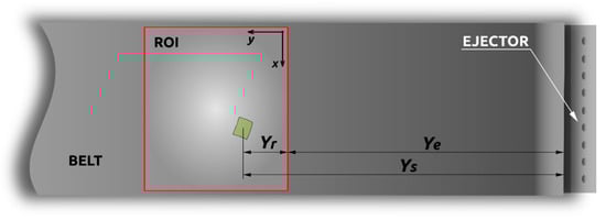 The distance between the granule in the image to be ejected and the nozzle was measured by an encoder. The encoder was mounted on a driven conveyor roller. The belt moves were determined by the encoder pulses. The y coordinate of the granulate, which represented the distance from the image edge, is Yr. Yr was converted from the pixel value to the number of encoder pulses and added to a constant Ye, representing the number of pulses from the image to the air nozzles, as shown in Figure 4. The value of pulses for ejecting Ys was written to the circular buffer running on the FPGA. The FPGA monitored the encoder value, and opened the air valve for the nozzle, according to the values in the circular buffer.