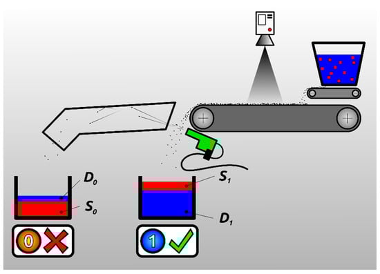 A schematic presentation of the testing system is shown in Figure 5. The clean granules are represented by the representatives of the clean granules class. Defective granules are a mixture of all other classes. Figure 5 shows two boxes for sorted material. After sorting, Box 1 would ideally contain only clean material. Box 0 contains defective ejected granules.