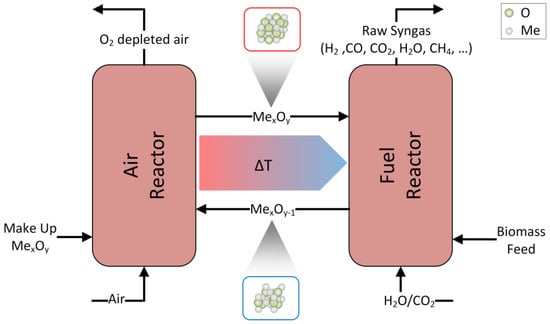 A similar gasification concept allowing for decent fuel conversions, without requiring an ASU is the chemical looping gasification (CLG) process, where biomass gasification is also carried out in two separate reactors (see Figure 1) [,,,,]. Just as the related chemical looping combustion (CLC) process, CLG is realized using two coupled fluidized bed reactors, in order to attain good heat and mass transport characteristics [,,]. Here, steam or carbon dioxide provide bed fluidization and gasification (see Equations (1) and (2)) of the feedstock in the fuel reactor (FR) [,]. Additional oxygen for the partial (see Equation (3)) or full (see Equations (4)–(6)) oxidation of gaseous hydrocarbon species, enhancing gasification kinetics and reducing the process endothermicity, is supplied through a circulating oxygen carrier (OC, MexOy) [,,]. Furthermore, the homogeneous water gas shift (WGS) reaction (Equation (7)) takes place inside the gas phase.