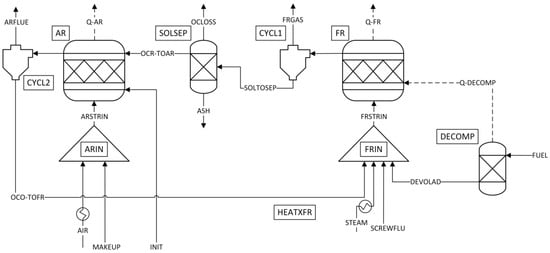 The deployed Aspen Plus™ model, shown in Figure 2, is largely adopted from a previous study by Ohlemüller et al. []. Here, the chemical reactions occurring in the AR and FR are modelled in two separate reactors, whereas gas-solid and solid-solid separation is achieved through cyclones and separators, respectively. In order to reduce model complexity, the AR and FR were modelled as equilibrium RGIBBS reactors in this work, as this simplification allows for a basic description of the most crucial phenomena required for process control and obviates the necessity of accurate kinetic data. To account for the solid circulation in chemical looping processes, a constant mass stream of solids continuously cycles through the system (OCR-TOAR/OCO-TOFR), after being added to the system after initiation of the simulation (INIT).