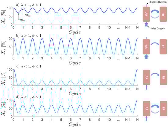 In order to assess how and have to be adjusted in order to obtain an efficient CLG process, one should first assess the general impact of these two parameters on the process. Due to the relative fast kinetics of the OC re-oxidation [,,], the oxygen carrier is often assumed to leave the AR in a (close to) fully oxidized state for in chemical looping processes. In contrast, sub-stoichiometric air-to-fuel equivalence ratios () only lead to a partial re-oxidation of the OC in the AR. Following the same logic, the OC material can be assumed to leave the FR in a (close to) fully reduced state in case , whereas partial reduction is attained for . From these deductions, it becomes clear that “standard” CLC operation is attained for and , [,]. Here, a highly oxidized OC leaves the AR, before being partially reduced in the FR, which is illustrated in Figure 3a.