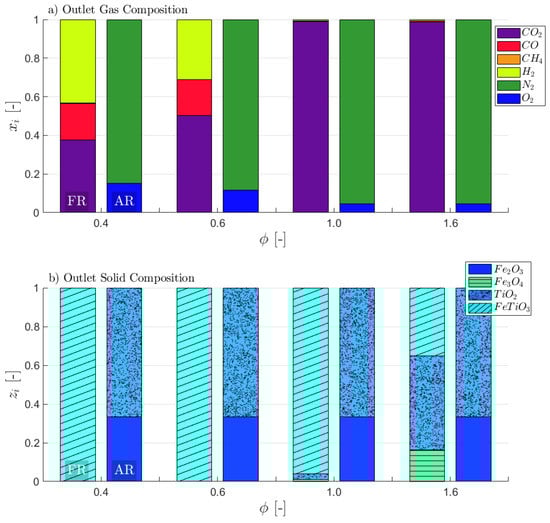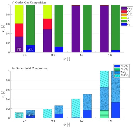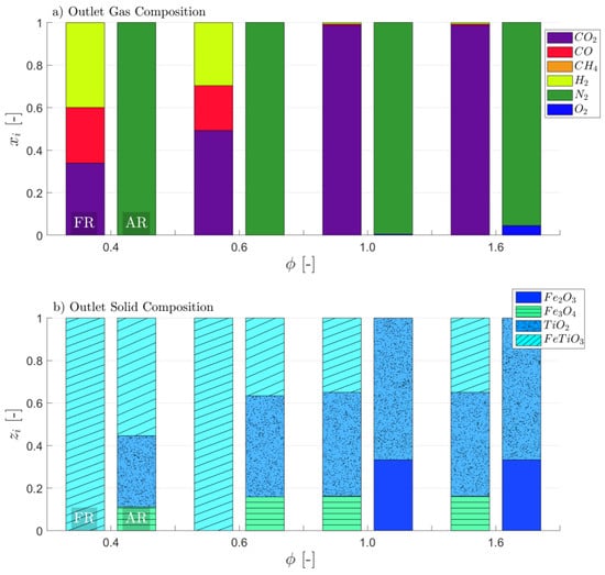 One approach to obtain CLG behavior, which has been suggested by Pissot et al. [], is reducing the amount of OC cycled through the system (), hence reducing . This approach can be deduced directly from Equation (12). Due to the resulting lower oxygen transport to the FR, syngas formation is favored, as less oxygen for full oxidation of the feedstock is provided by the OC. The simulation results for this approach are given in Figure 4. When considering the gas composition (Figure 4a) of the streams leaving the air and fuel reactor, various trends are visible. As expected, the syngas content in the gaseous FR products increases with decreasing OC circulation rate, which can directly be attributed to the lower oxygen/fuel ratio in the FR. Consequently, steam and CO2 formation decrease. Yet, it has to be noted that substantial syngas concentrations are only attained for , which requires significant reductions in the OC circulation rate, when compared to CLC, where OC-to-fuel equivalence ratios as high as 8 [] and 25 [] are reported in literature for solid and gaseous fuels, respectively. For the gas concentrations leaving the AR, a strong impact of on the effluent oxygen is visible. As the inlet air mass flow was not varied ( = 1.2), this observation is clear, as less O2 is removed from the gas stream due to the lower OC circulation for . Furthermore, the CO2 content in the AR product is predicted to be insignificant, indicating a complete char conversion, which is expected in chemical equilibrium. When considering Figure 4b, showing the solid composition after the fuel and air reactor, it can be seen that the OC leaves the AR and FR in a fully oxidized (Fe2O3 + TiO2) and reduced (FeTiO3) state, respectively for , whereas the OC is only partially reduced (indicated through the presence of Fe3O4) in the FR in case exceeds unity. Hence, the fraction of FeTiO3 leaving the FR strongly increases with decreasing OC circulation, signifying a higher degree of reduction of the OC, due to the lower oxygen availability. As expected one consequently obtains chemical looping combustion behavior (see Figure 3a) for oxygen-carrier-to-fuel equivalence ratios greater than unity (, whereas chemical looping gasification behavior (see Figure 3b) is attained for .