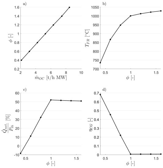 The impact of the air-to-fuel equivalence ratio () on is shown in Figure 9a. In CLC mode (), where full OC oxidation is achieved in the AR (i.e., ), assumes a constant value, given by the amount of oxygen which is transported by a fully oxidized OC for a given circulation rate, regardless of the deployed air-to-fuel ratio (see Equation (12)). In contrast, lowering to values below unity to attain CLG operation means that and are equal, as the oxygen transport to the FR is limited by the oxygen availability in the AR: