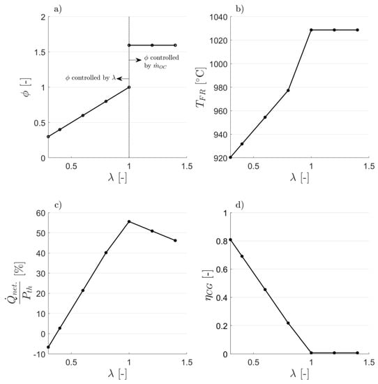 Simulation results for CLG operation through reducing . OC-to-fuel ratio as a function of the air-to-fuel equivalence ratio (a). Fuel reactor temperature (b), relative net process heat (c), and cold gas efficiency (d) for different values of ().