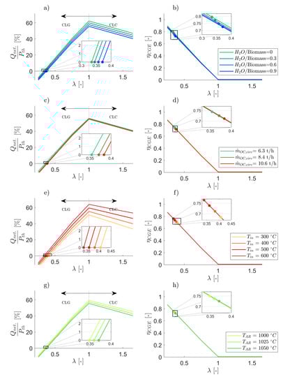 Net heat release and cold gas efficiency for CLC/CLG process as a function of the air to fuel equivalence ratio for different steam to biomass ratios (a,b), OC circulation rates (c,d), gas inlet temperatures (e,f), and air reactor temperatures (g,h). Circles mark the cold gas efficiency for autothermal CLG operation (, so for and for ).