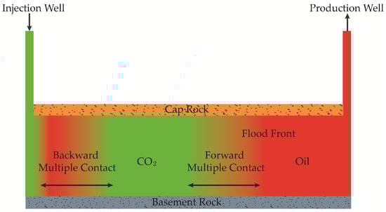 Carbon dioxide (CO2) is the most common type of gas used in gas injection and has been widely used in the EOR method for light oils. Injected CO2 acts as a solvent to reduce oil viscosity and expand oil volume in reservoirs. These phenomena occur more frequently under miscible conditions than they do under immiscible conditions []. As shown schematically in Figure 1, miscibility conditions during CO2-EOR can be achieved via multiple contact processes that make use of condensing and vaporizing gas drives. At the injected CO2 front, intermediate molecular weight hydrocarbons evaporate from the reservoir oil into the CO2, where they equilibrate with the CO2 to take part in the next contact with the reservoir oil in a phenomenon called the vaporizing gas drive or the forward multiple contact process. After each contact, however, the equilibrated reservoir oil behind the injected CO2 close to the injector is continuously mixed with fresh CO2 in a process called the condensing gas drive or the backward multiple contact process [,]. Due to the mass transfer of intermediate hydrocarbons between CO2 and oil, the composition and properties, such as the density and viscosity, of the reservoir oil and injected gases are changed. This, in turn, leads to a difference in the interfacial tension (IFT) between the equilibrated oil and gas at each location. As the reservoir approaches the miscible condition, the oil viscosity and IFT decrease, such that the IFT tends towards zero and the miscible condition is reached with a reservoir pressure higher than the MMP [].