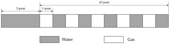 A two-dimensional (2D) homogeneous model based on the work of Cho et al. [] is designed to focus on investigating the miscibility and sweep efficiency without gravity override during WAG simulations. This reservoir model is discretized into 33 × 33 × 1 grid blocks of volume 3 × 3 × 3 m3 each. A quarter of a 10-acre five-spot well pattern (i.e., CO2 injector and oil producer) is set up for the reservoir model. Thus, the EOR and CCS performances are mainly governed by the displacement and sweep efficiencies. The total simulation period is 13 years (2007–2020), beginning with 3 years of waterflooding followed by 10 years of WAG, as shown schematically in Figure 2. The WAG consists of five cycles, in each of which water and gas are injected sequentially. Four WAG model simulation cases are analyzed, namely: 100% CO2 + 0% CH4 (Case 1), 90% CO2 + 10% CH4 (Case 2), 80% CO2 + 20% CH4 (Case 3), and 70% CO2 + 30% CH4 (Case 4). The gas injection rate for each case is a constant 2265 m3/day under surface conditions to determine the effects of CO2 and CH4 compressibility upon EOR performance while excluding the effect of any difference in injection rate. The initial conditions for the reservoir model are presented in Table 4. Thus, the producing bottom hole pressure is fixed at 13,789 kPa, while the initial reservoir pressure and temperature are computed on the basis of hydrostatic and geothermal gradients.