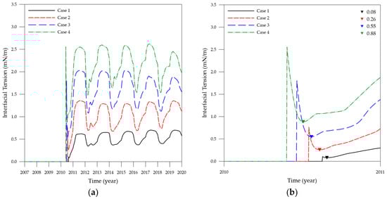 The decrease in displacement efficiency due to CO2-CH4 co-injection is described in terms of the IFT between the displacing and displaced fluids in the middle of the reservoir (grid block co-ordinates (17, 17, 1)) during the 13-year WAG in Figure 3. Due to the lower molecular weight of CH4 compared to CO2, the addition of CH4 makes the displacing fluid lighter and the IFT of the gas mixture higher compared to that of Case 1, as indicated in Figure 3a. In addition, the IFT after the multiple contact with the initial oil (2010–2011) is examined more closely in Figure 3b. Here, Case 1 gives the lowest IFT value of 0.08 mN/m between the CO2 and reservoir oil, while Cases 2, 3, and 4 give 225%, 588%, and 1000% higher values of 0.26, 0.55, and 0.88 mN/m, respectively.