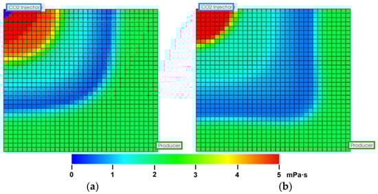 Meanwhile, the decrease in displacement efficiency due to CO2-CH4 co-injection is described in terms of the 2D change in oil viscosity when 0.15 PV of gas is injected in Figure 4. The blue swept area in Figure 4a indicates that the injected fluids make maximum contact with the reservoir oil in Case 1, and that the minimum oil viscosity in this Case is 0.46 mPa·s. When 20% mole fraction of CH4 is added into the CO2 injection stream (Case 3), the deep blue region of Figure 4a changes to the light blue area of Figure 4b, indicating a 23.9% increase in the oil viscosity from 0.46 mPa·s to 0.57 mPa·s. The injected gas displaces the light and intermediate oil components from the initial oil, thereby increasing the oil viscosity after the multiple contact. For Case 1, the oil viscosity near the gas injector is zero because the oil is displaced by the high injection pressure and is miscible with the CO2. In addition, Figure 4 shows that the injection gas front in Case 3 is more convex than that in Case 1. This is because less gas is acting as a solvent to reduce the oil viscosity, while the fraction of injected gas that does not come into contact with the oil creates a gas channel that leads to early breakthrough of produced gas, as indicated in Figure 5.