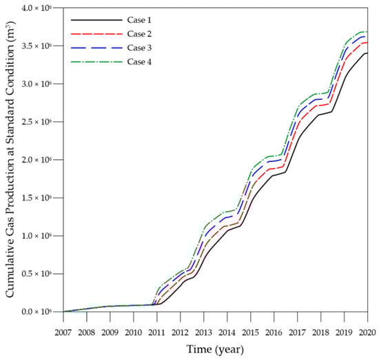 Cumulative gas production obtained from the four CO2-CH4 WAG cases under standard conditions.