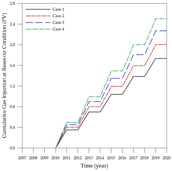 Cumulative gas injection obtained from the four CO2-CH4 WAG cases at the reservoir condition (T = 63 °C).