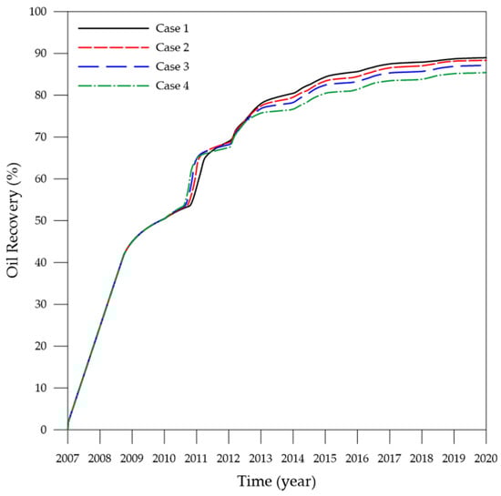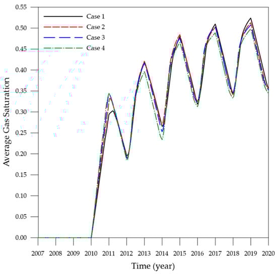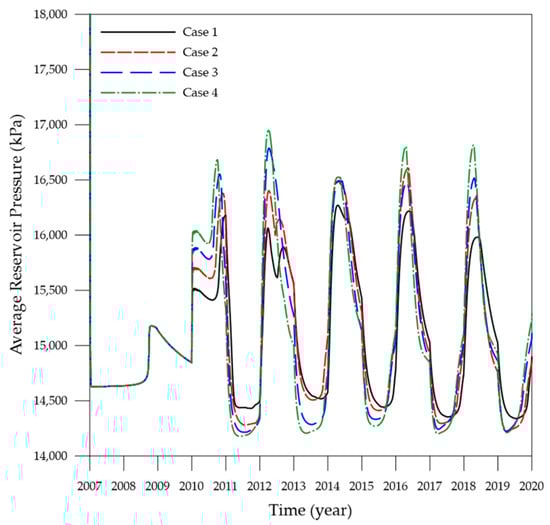 The cumulative gas injection under the reservoir condition obtained from the four CO2-CH4 WAG cases is indicated in Figure 6. Note that although the gas injection rate at the surface is constant, the volume occupied by gas differs in each case because CH4 is less compressible than CO2; hence, the more CH4 is added, the higher the gas injection rate at the reservoir (Jin et al., 2017). In addition, the average gas saturation in each of the four cases for the ten-year WAG period is indicated in Figure 7. In the first WAG cycle (2010–2012), Case 1 displays the lowest average gas saturation, while Cases 2 to 4 indicate that the average gas saturation increases with increasing addition of CH4 to the gas stream as CH4 occupies more reservoir pore volume than does CO2. Interestingly, this trend is reversed in the subsequent WAG cycles due to the poor sweep efficiency resulting from the CH4 addition, so that the average gas saturation eventually becomes the lowest for Case 4 by the end of the final WAG cycle (2019). Meanwhile, the average reservoir pressure obtained from the four CO2-CH4 WAG cases is indicated in Figure 8, where the greater pore occupation by CH4 is seen to increase the average reservoir pressure due to the lower compressibility of CH4 relative to CO2. As a result, the co-injection of CO2-CH4 generates higher oil recovery than the pure CO2 WAG during the early stages of WAG (2010–2012), but reduces the overall oil recovery at the end of the WAG process, as indicated in Figure 9. This is because the effects of displacement and reduction in sweep efficiency become more dominant than that of compressibility as the WAG proceeds.