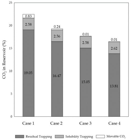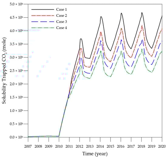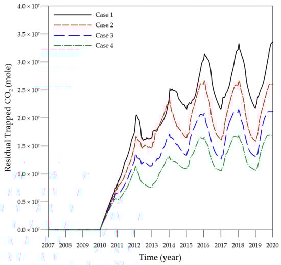 As indicated in Figure 7, the addition of CH4 to the CO2 stream reduces the WAG sweep efficiency and gas saturation, thus decreasing the (Equation (4)) to lower the trapped gas saturation, . As a result, the residual trapped CO2 by hysteresis (Figure 10) is seen to decrease as the ratio of CH4 to CO2 in the gas stream increases. In addition, the amount of solubility-trapped CO2 decreases as the concentration of CH4 increases, as indicated in Figure 11. However, this decrease is primarily due to the reduced volume of injected CO2 and does not mean that the addition of CH4 lowers the performance of solubility trapping. As mentioned in Section 3.2., the injected total gas rate is set to a constant of 2,265 m3/day, so that the amount of injected CO2 decreases with increasing CH4 addition.