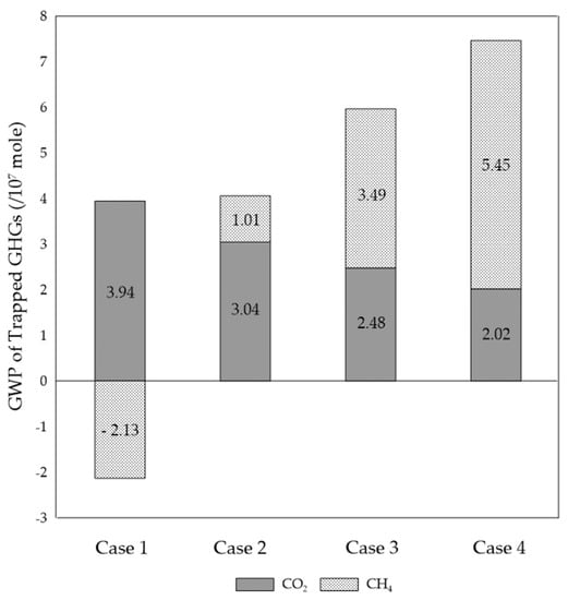 Although the above results elucidate the aspect of CO2 sequestration, it is also necessary to consider the contribution of CH4 storage because the GWP of CH4 is about 28 times that of CO2. The GWP is an index of the relative amount of heat trapped by a unit mass of other GHGs compared to CO2. In the present study, the GWP is transformed into the index per 107 moles of GHG. GWP of CH4 per 107 moles is ten times higher than that of CO2 with consideration for the molecular weight of each gas. In other words, the effect of 1 mole of CH4 sequestration upon the prevention of global warming is the same as that of 10 moles of CO2 sequestration. Thus, the relative amounts of trapped GHGs are presented in Figure 13, where 107 moles of trapped CO2 and CH4 are quantified as 1 and 10, respectively. For Case 1, the net GWP of trapped gases is 3.94 − 2.13 = 1.81, under the assumption that CH4 is only produced without re-injection into the reservoir. As the CH4 concentration increases, the trapped GWPs for the co-injection cases are increased by 123%, 230%, and 313% respectively, compared with Case 1 due to the CH4 sequestration effect in spite of the reduction in CH4 storage.