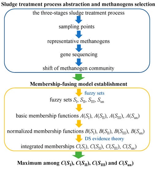 However, study on the shift of methanogen community in a sludge-treatment process has not been investigated yet. For a wastewater treatment plant, a clear characterization of the shift of methanogen community could reflect the efficiency and environmental condition of different processing stage, which could provide workers an advisable instruction to regulate the sludge-treatment process. In each sludge-processing stage, the structure of methanogen community is unique and in a relative stable range of change because of the heterogeneous and relatively steady environmental condition each stage provides. Therefore, the boundary of the methanogen community structure between two processing stages could not be such clear. Furthermore, the data error caused by sample contamination and faults occurring in data measurement and analysis processes has not been fully taken into consideration when analyzing the microbial information in previous research. Although paralleling samples were collected to weaken the data error, the method to process the paralleling data is just taking the average value. If the paralleling data deviated extremely, the average value could not represent the authentic one. Fuzzy sets are good at describing the vagueness of a certain phenomenon and uncertainty caused by data error [32,33,34], and Dempster-Shafer (DS) evidence theory is adept at fusing imprecise and conflict data from multi-sources [35,36]. Both theories are combined to resolve the problem of the uncertain boundary of the methanogen community structure between two sludge-processing stages and data error generated among paralleling data.