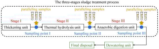 The prior technical route to treat surplus sludge for a wastewater treatment plant in China is thickening, thermal hydrolysis, AD, dewatering and final disposal [1], as is shown in Figure 2. To be specifically, thickening, either gravity, or floatation, or mechanical thickening, aims to reduce water content of the sludge to be about 95%, which benefits the subsequent steps. Thermal hydrolysis purposes to improve the efficiency of AD process by enhancing the degradability of organic compounds and methane yields [13,14]. AD is the critical processing stage to degrade sludge. Dewatering, belt dewatering, centrifugal dewatering, and plate-frame dewatering included, is designed to compress the sludge volume, which alleviates the burden on the final disposal. To understand the efficiency of the sludge-treatment process, AD processing stage is widely considered to be the essential point [5,6]. As is shown in Figure 2, the three stages—two stages before AD which could affect the effect of AD, and AD stage, defined as Stage I, II, and III—must be the concerned processing stages in the sludge-treatment process. Sampling points are set at the exit of each processing stage among the three stages to collect sludge samples for further analysis on methanogen community, as is shown in Figure 2. Sludge samples from sampling point I, after thickening and before thermal hydrolysis, could characterize the feature of sludge in stage I. Sampling point II and III, after thermal hydrolysis and before AD, and after AD and before dewatering, could represent stage II and III, respectively. Paralleling sludge samples with a certain number, usually ranging from 3 to 10, are gathered from each processing stage.