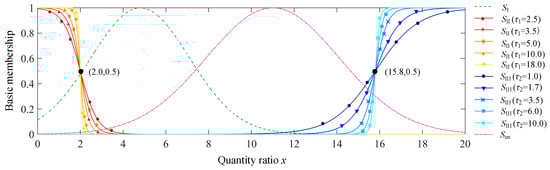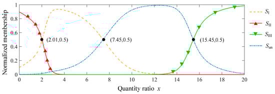 As is shown in Figure 4, the relatively low x produces the higher membership of SII compared with memberships of SI, SIII, and Sun, while the relatively large x generates the bigger A(SIII) compared with other three memberships. With the increase of x, A(SII) falls rapidly to 0, while A(SIII) climbs lately to 1. As x increases, A(SI) goes up to 1 fast and then goes down, while A(Sun) rises slowly to 1 and then descends. A(SII), or A(SI), or A(Sun), or A(SIII) predominates within a certain range of x. Furthermore, the larger the values of τ1 and τ2, the bigger the gradients of A(SII) and A(SIII), and the smaller the uncertainties of fuzzy sets SII and SIII. When τ1 and τ2 exceed 10.0 and 6.0, respectively, the two fuzzy sets almost convert to the non-fuzzy sets with the threshold of x values being 2.0 and 15.8. In this model, 3.5 and 1.7 are set to be the values of τ1 and τ2. Figure 5 describes the trends of the normalized membership functions in Equation (4) with the parameters determined above. As can be seen, SII is predominant when x is below 2.01, SI and Sun play decisive role when 2.01 < x < 7.45 and 7.45 < x < 15.45, respectively, and it is most probable of x values belonging to SIII when x is above 15.45.
