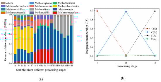 To prove the accuracy of the membership-fusing model, characterized by Equations (2), (4) and (5) with the determined parameters, a group of 18 sludge samples collected in the first day in September, 2019 was chosen to measure the mcrA gene sequences to verify whether the sequencing data satisfy the membership functions. Figure 6a exhibits the distribution of the relative abundance of different genera methanogens from all samples of the three stages, from which the value of quantity ratio of Methanosaeta to Methanobacterium could be obtained according to Equation (1). The six paralleling x values of stage I were calculated to be 7.15, 7.09, 7.01, 7.26, 7.08 and 6.98, between 2.01 and 7.45, within the range of x where the membership function of SI predominates. This result demonstrates the processing stage affiliation of the tested paralleling samples being Stage I, which in turn reveals the applicability of B(SI) and A(SI). The six paralleling x values obtained from samples of Stage II are 1.63, 1.58, 1.62, 1.57, 1.71 and 1.69, ranging from 0 to 2.01, indicating these samples are most likely from Stage II and the feasibility of B(SII) and A(SII). The six paralleling x values of Stage III are 15.69, 15.61, 15.73, 15.72, 15.70 and 15.65, all above 15.45, reflecting these samples most probably belong to Stage III and the fitness of B(SIII) and A(SIII). All x values generated from the 18 sludge samples distribute outside the range, from 7.45 to 15.45, showing the rationality of B(Sun) and A(Sun). These three results indicate the accuracy of the membership functions was verified in the aspect of the rational distribution of x values and the unique methanogen structure of each processing stage could also be properly distinguished by the model.