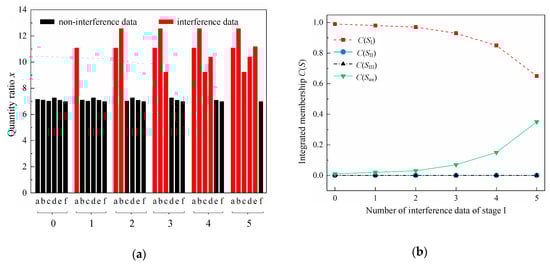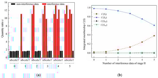 The existence of sample contamination and incidental and instrumental data errors resulted from data measurement and analysis is inevitable, therefore, the x value of Sun from which could not make a determinate judgment on the processing stage among the three stages most likely exists. This type of x value, known as the interference data, would impair the reliability of the model when deciding the specific sludge-processing stage. DS evidence theory is introduced to address such problem of data impreciseness and conflict among paralleling data. To verify the performance of the model in dealing with different numbers of interference data, a group of interference data with the number below the number of the total paralleling data was introduced to one processing stage. Eighteen x values, the same with that in Section 4.1, were chosen to be the non-interference data group. The interference data group was generated through computer random selection. For Stage I, the interference data were generated from x values obtained from paralleling sludge samples of Stage I collected from 2014 to 2018. The specific values were determined by computer randomly selecting five x values whose maximal normalized memberships were B(Sun), which could not indicate a determinate processing stage among the three stages. One interference data was brought to the six paralleling non-interference data each time, five interference data were brought in in total and the number of the total paralleling data was maintained to be six. The same operation was conducted to the other two groups x values belonging to Stage II and III, respectively. For one stage, five interference data were generated, and one data was introduced one time.