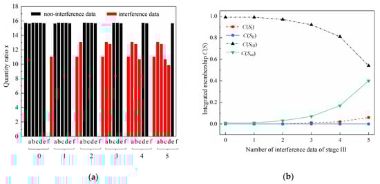 The non-interference data together with the five groups x values generated by introducing one to five interference data in turn for Stage I are shown in Figure 7a. All interference data are distributed in Sun. The corresponding integrated memberships of each fuzzy set calculated from these six groups of data are exhibited in Figure 7b. C(SI) are 0.99, 0.98, 0.97, 0.93, 0.85 and 0.65, and C(Sun) are 0.01, 0.02, 0.03, 0.07, 0.15 and 0.35 with the increasing number of interference data. C(SII) and C(SIII) are in a negligible range of change approximately around 0. As is shown in Figure 7b, as the number of interference data increases, the integrated membership of SI goes down and that of Sun goes up, and C(SI) is the largest among the six groups. This consequence indicates that with the increasing number of interference data, the probability of this group of paralleling sludge samples belonging to Stage I declines, the uncertainty of which stage these paralleling samples are from rises, which reveals that the credibility of the five data groups with interference data descends and sample contamination and faults occurring in data measurement and analysis might appear. Furthermore, interfering x values with the number below the total paralleling data could not change the maximal integrated memberships being C(SI). In other words, the interference data could not play a decisive role in determining the stage affiliation of a group of paralleling samples, but could weaken the belief degree on the judgment on the processing stage affiliation being stage I. When only one non-interference data left for Stage I, C(SI), C(SII), C(SIII) and C(Sun) are 0.65, 0.00, 0.00 and 0.35, close to 0.60, 0.00, 0.00 and 0.40, values of B(SI), B(SII), B(SIII) and B(Sun) when x value is 6.98, the last non-interfering x in this data group. This result reflects that the calculation of integrated memberships would depend more on x values of SI than x values of Sun, indicating the stage affiliation judgment would more rely on the valid information rather than the uncertain one. Condition (6) explains this situation. When intersecting with any other fuzzy set, Sun does not work, so that the influence brought by the interference information would be eliminated, and the interference data could be reasonably fused to make a reliable stage affiliation judgment. It could be concluded that the smaller the number of interference data belonging to SI, the higher the integrated membership of SI, the more credible this group of data, and the more reliable the judgment on the processing stage affiliation being stage I. When x values belonging to Sun appear, the determination of the processing stage would be more dependent on valid x values belonging to SI than invalid x values pertaining to Sun. Consequently, the model could authentically reflect the appearance of imprecise and conflict data, fusing all the information reasonably and make a reasonable judgment on the processing stage affiliation for stage I. The reliability of the model in addressing different numbers of interference data is guaranteed.