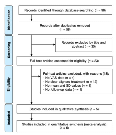 Our main objective in this systematic review was to compare the discomfort levels between clear aligners and fixed appliances. Second, we analyzed analgesic consumption difference between the aforementioned orthodontic appliances. The review PICO research question is “Do clear aligners have less pain discomfort impact than fixed appliances treatment in orthodontic patients?”, with the following statements: orthodontic patients (patients—P); clear aligners (intervention/exposure—I); fixed appliances (comparison—C); pain discomfort (outcome—O). Our null hypothesis was that clear aligners cause similar pain perception than conventional fixed appliances.