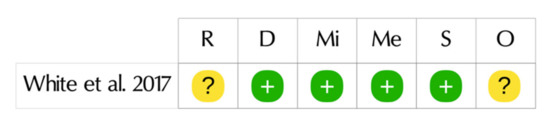 - Sterne, J.A.C.; Savović, J.; Page, M.J.; Elbers, R.G.; Blencowe, N.S.; Boutron, I.; Cates, C.J.; Cheng, H.Y.; Corbett, M.S.; Eldridge, S.M.; et al. RoB 2: A revised tool for assessing risk of bias in randomised trials. BMJ 2019, 366, 1–8. [Google Scholar] [CrossRef] [PubMed]