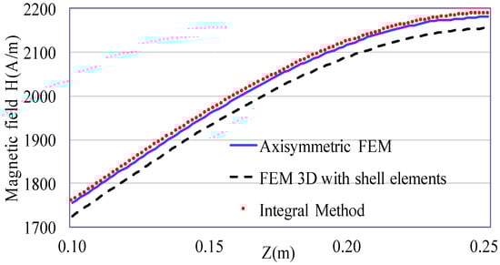 This academic example is solved by three numerical methods, where the first one is the axisymmetric FEM, the second one is a shell element formulation implemented in 3D FEM method [] and the last one is the proposed integral method with the surface elements. In order to valid our method and to compare different approaches, we mainly focus on the computed current in the conductor and the magnetic field in the air region close to the device (calculated on the path AB, for A (0.25; 0; 0.1) and B (0.25; 0; 0.25)).