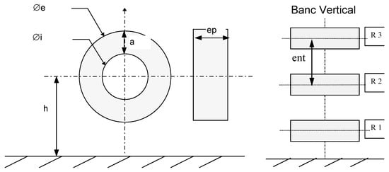 The second test problem is the modelling of a practical device proposed by the EDF (Electricité de France) []. The power station “Folies” is equipped with a three-phase reactance to limit short-circuit currents. In this case, the current in each reactance is 1000 A phase-shifted with 120 degrees, the frequency is 50 Hz (Figure 5).