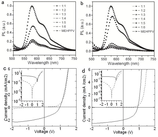 Figure 2. Photoluminescence intensity of MEH-PPV: CdSe nanocrystal (NC) blends as a function of the weight fraction of CdSe NCs under excitation at 500 nm: (a) CdSe NCs prepared by Se powder, (b) CdSe NCs prepared by trioctylphosphine/Se injection. Current density–voltage (JV) characteristics of a MEH-PPV: CdSe NC device with the weight ratio of 1:8 (c) without and (d) with annealing at 180 °C for 20 min. The dotted line was measured in the dark and the solid line under 1.5 AM solar illumination. The insets are the JV curves with current density (J) expressed in logarithmic coordinates. Reproduced with permission from [22], Copyright © 2006, IOP Publishing.