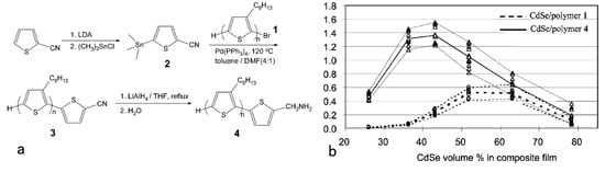 Figure 3. (a) Synthesis route for P3HT with amino end-functionality. (b) Plots of power conversion efficiency (PCE) versus the volume ratio of CdSe with polymer 4 (solid lines) and polymer 1 (dashed lines) as the donor, respectively. Note the very high reproducibility of the lowest, highest and average performance for numerous duplicating devices. Reproduced with permission from [29], Copyright © 2004, American Chemical Society.