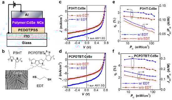 Figure 4. Performance enhancement in polymer: NC hybrid solar cells (HSCs) upon EDT treatment. (a) Schematic structure of polymer: NC HSCs. (b) TEM image of CdSe nanorods (scale bar: 20 nm) and chemical structures of conjugated polymers (P3HT and PCPDTBT) and EDT. The nanorods have an aspect ratio of 7. J-V characteristics of (c) P3HT:CdSe and (d) PCPDTBT:CdSe HSCs with/without EDT treatment. (e,f) Dependence of illumination power on PCE and Jsc/P0 for P3HT:CdSe and PCPDTBT:CdSe HSCs with/without EDT treatment, respectively. Reproduced with permission from [37], Copyright © 2013, American Chemical Society.