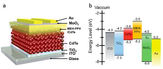 In the case of the BHJ photovoltaic device, the blend mixture includes a conjugated polymer and a semiconductor NC. The carrier recombination between the hybrid layer and the contact electrode is serious, which renders the performance of the HSC. It was confirmed that the self-assembly property of the active solution in the coating process significantly affects the phase separation of the dried hybrid layer, which is important for the carrier departure and charge migrate [51,52]. As for the polymer/fullerene blend solar cells, it is well known that the donor/acceptor phase separation in the vertical distribution in the polymer/fullerene blend film is also critical to device performance [53,54]. Therefore, an optimized device architecture for HSCs may consist of multi-film such as donor: acceptor (BHJ)-donor-acceptor structure (D:A-D-A) for optimizing interface engineering. With this strategy, the charge recombination is reduced, which has been demonstrated in small molecule OSCs [55,56]. For HSCs, Liu et al. [57] designed a device with a configuration of ITO/TiO2/CdTe/MEH-PPV:CdTe/MoO3/Au based on aqueous-processed CdTe NCs and MEH-PPV. Figure 5a and Figure 5b show the schematic device structure and band alignment of semiconductor NCs and the polymer.