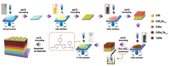 Figure 6. A schematic outline of the layer-by-layer process for making CdTe NC solar cells with a crosslinkable HTL. Reproduced with permission from [75], Copyright © 2019, WILEY-VCH Verlag GmbH & Co. KGaA, Weinheim.