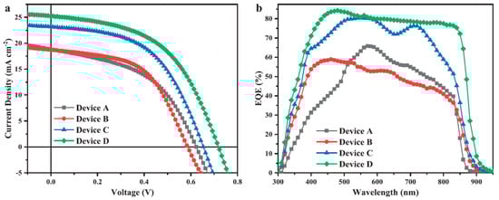 Figure 7. (a) J–V curves of CdTe NC solar cells with different structures (Device A: ITO/ZnO/CdS/CdTe/Au; Device B: ITO/ZnO/CdSe/CdTe/Au; Device C: ITO/ZnO/CdS/CdSe/CdTe/Au; Device D: ITO/ZnO/CdS/CdSe/CdTe/HTL/Au; (b) corresponding EQE spectra. Reproduced with permission from [75], Copyright © 2019, WILEY-VCH Verlag GmbH & Co. KGaA, Weinheim.
