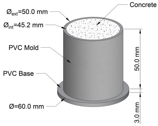 Similar to the research conducted by Mínguez, Vicente and co-workers [53,54], the molds for the concrete specimens were made by using PVC cylinders of 45.2 mm inner diameter, 50 mm outer diameter and 50 mm height. A PVC disc of 60 mm diameter and 3 mm thickness was welded at the bottom of each pipe, in order to guarantee a tight connection (Figure 1).