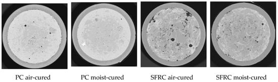 In this case, all the specimens were scanned at the age of 28 days, i.e., when the hardening process of concrete was almost finished and no relevant variations of the pore morphology were expected. The analysis of the evolution of the pore morphology during the hardening process has been previously studied [54,55].