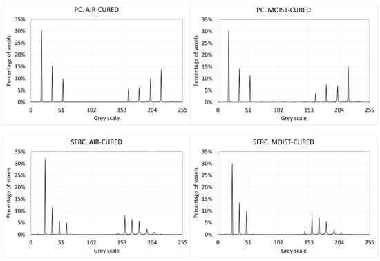 The results shown in Figure 6 agree with the ones shown in Table 2. First, it is observed that plain concretes show a porosity clearly smaller than fiber-reinforced concretes. This happens in both air-cured and moist-cured concretes. As explained before, this is due to the lower capacity of plain concrete to retain the largest voids, which directly implies a reduction of the porosity.